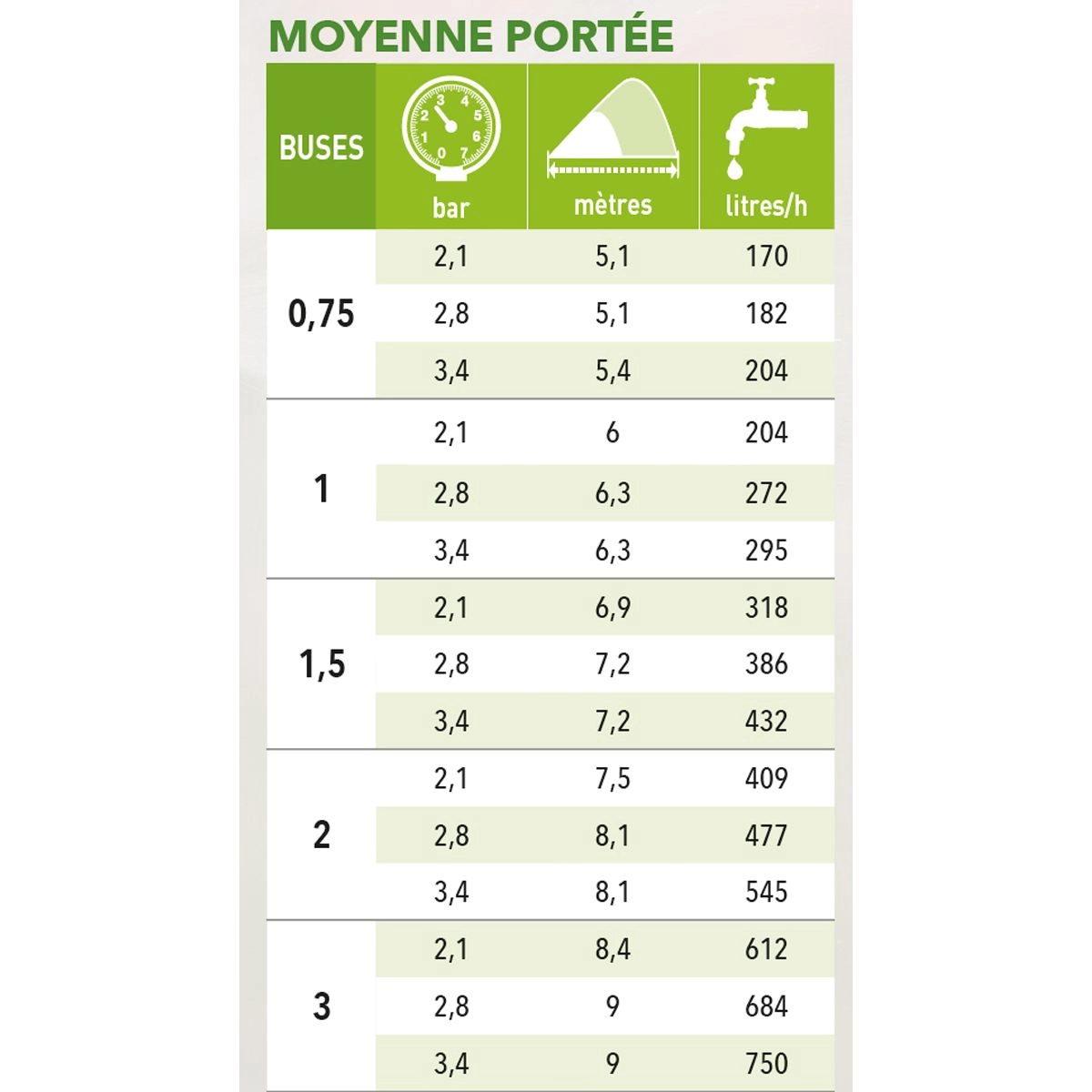 Elle permet de couvrir une zone de 5,1 à 9 m de rayon pour une pression de 2,1 à 3,4 bars.
